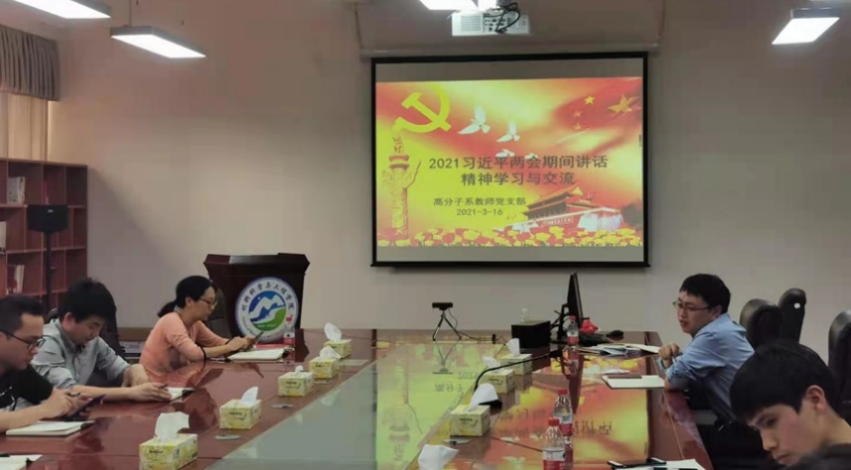 2021年3月16日下午,williamhill官方网站高分子系教师党支部在williamhill官方网站4B306会议室开展了“学习两会重要讲话精神,落实做四有好老师”主题党日活动。