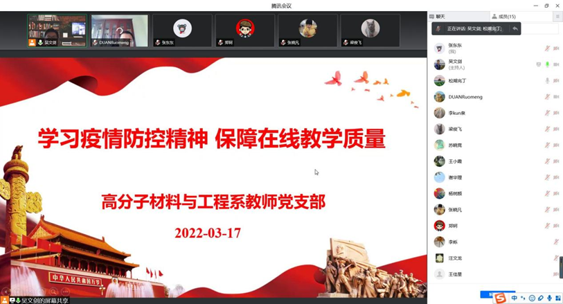 2022年3月17日,高分子系全体教师党员以腾讯会议形式开展“学习疫情防控精神 保障在线教学质量”活动,并集体学习国家主席习近平二Ο二二新年贺词。会议由高分子系支部书记吴文剑主持。