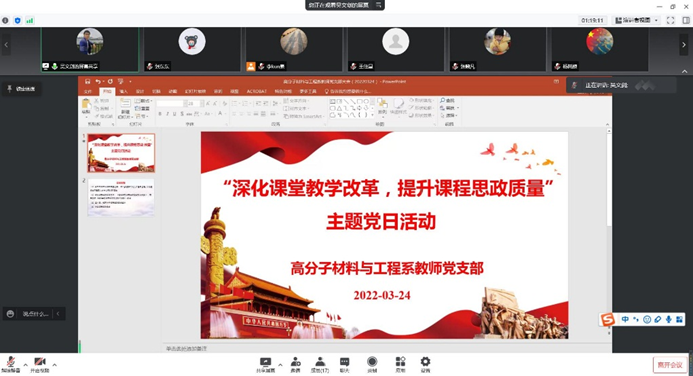2022年3月24日晚,高分子系全体党员教师于腾讯会议召开了“深化课堂教学改革,提升课程思政质量”主题党日活动,会议由支部书记吴文剑主持。