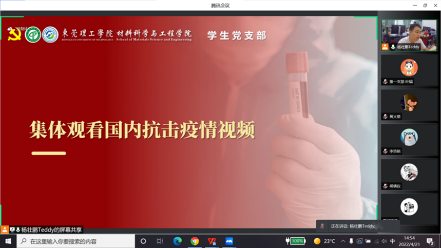会议首先由各支部全体师生党员一同在线上观看关于抗击疫情的宣传教育视频。通过一个个感人故事、暖心画面,让现场党员员工体会到守望相助、携手而行的力量,充分认识到正是广大无私的志愿者通过特有的方式,默默地推动着城市在疫情中坚定前行,不断汇聚更多的力量抗击疫情。
