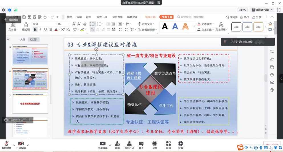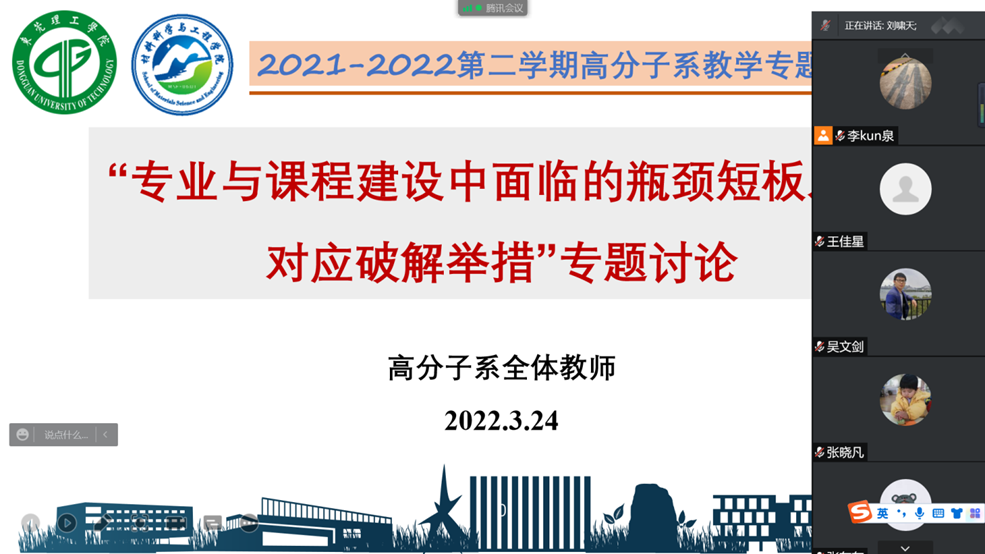 为了贯彻落实公司关于“深化课堂教学改革,提升课程育人质量”决策部署与公司思政建设的要求,2022年3月24日,williamhill官方网站高分子系通过腾讯会议视频的方式,召开了“专业与课程建设中面临的瓶颈短板及其对应破解举措”专题研讨,会议由系主任李坤泉主持,高分子系全体教师参加。