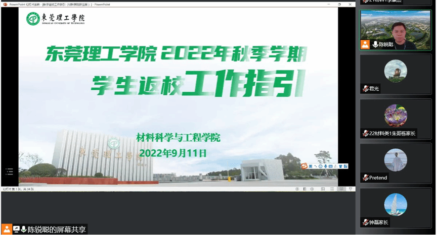 最后,辅导员陈锐聪为新生家长讲解员工返校工作指引。他从入校前、入校时、入校后三个方面向家长们讲述入学工作的注意事项,并在互动环节耐心仔细地解答同学及家长的疑问。