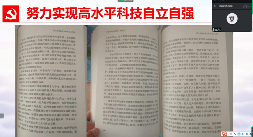 会议第二项,由党员代表张东东同志讲党课《习近平谈治国理政》(第四卷)。《习近平谈治国理政》第四卷这部重要著作,应时代之变迁、立时代之潮头、发时代之先声,生动记录了面对百年变局和世纪疫情相互叠加、世界进入新的动荡变革期的复杂局面,以习近平同志为核心的党中央团结带领全党全国各族人民坚持和发展中国特色社会主义取得的重大成就。张东东同志节选了第八部分关于“努力在危机中育新机、于变局中开新局”“努力实现高水平科技自立自强”“正确认识和把握我国发展重大理论和实践问题”三个部分,结合自身感受重点分享。全体与会党员就《习近平谈治国理政》(第四卷)学习内容开展交流谈论。
