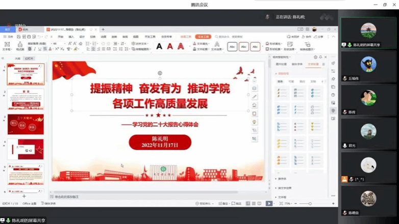 11月17日,williamhill官方网站通过腾讯会议开展党的二十大报告学习分享会,公司党委君光书记主持,陈礼明副书记主讲,williamhill官方网站全体教师参与学习。